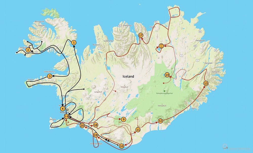 Nous avons été contraints de scinder notre séjour en 2 parties car la location d'un 4x4 pendant toute la durée du voyage était trop onéreuse. Nous avons donc opté pour la location d'une petite voiture (Clio) pendant les 8 premiers jours, puis nous avons loué un 4x4 pendant les 12 jours suivants afin de parcourir les pistes intérieures. Devant revenir à Reykjavik pour échanger les voitures, nous n'avons pas pu faire une boucle classique de l'île.Nous avions la chance d'avoir 4 nuits d'hôtel offertes à Reykjavik. Comme nous devions réserver les dates en avance, nous avons choisi les 4 derniers jours où nous avions notre Clio, afin de faire un break avec le camping. Sur place, nous avons donc rayonné pendant 3 jours depuis l'hôtel, ce qui explique les allers-retours depuis Reykjavik.Nous n'avions volontairement planifié aucun circuit avant de partir. Ainsi, nous avons adapté notre trajet à la météo islandaise qui a été plutôt capricieuse pendant les 15 premiers jours. Voila pourquoi nous avons fait quelques détours et autres boucles pour chercher un peu de soleil.Je précise aussi que nous avions un rythme plutôt soutenu avec de grosses journées bien chargées. En général on démarrait nos journées à partir de 8h-9h le matin pour finir jusqu'à 22h-minuit, voir 1h du matin.